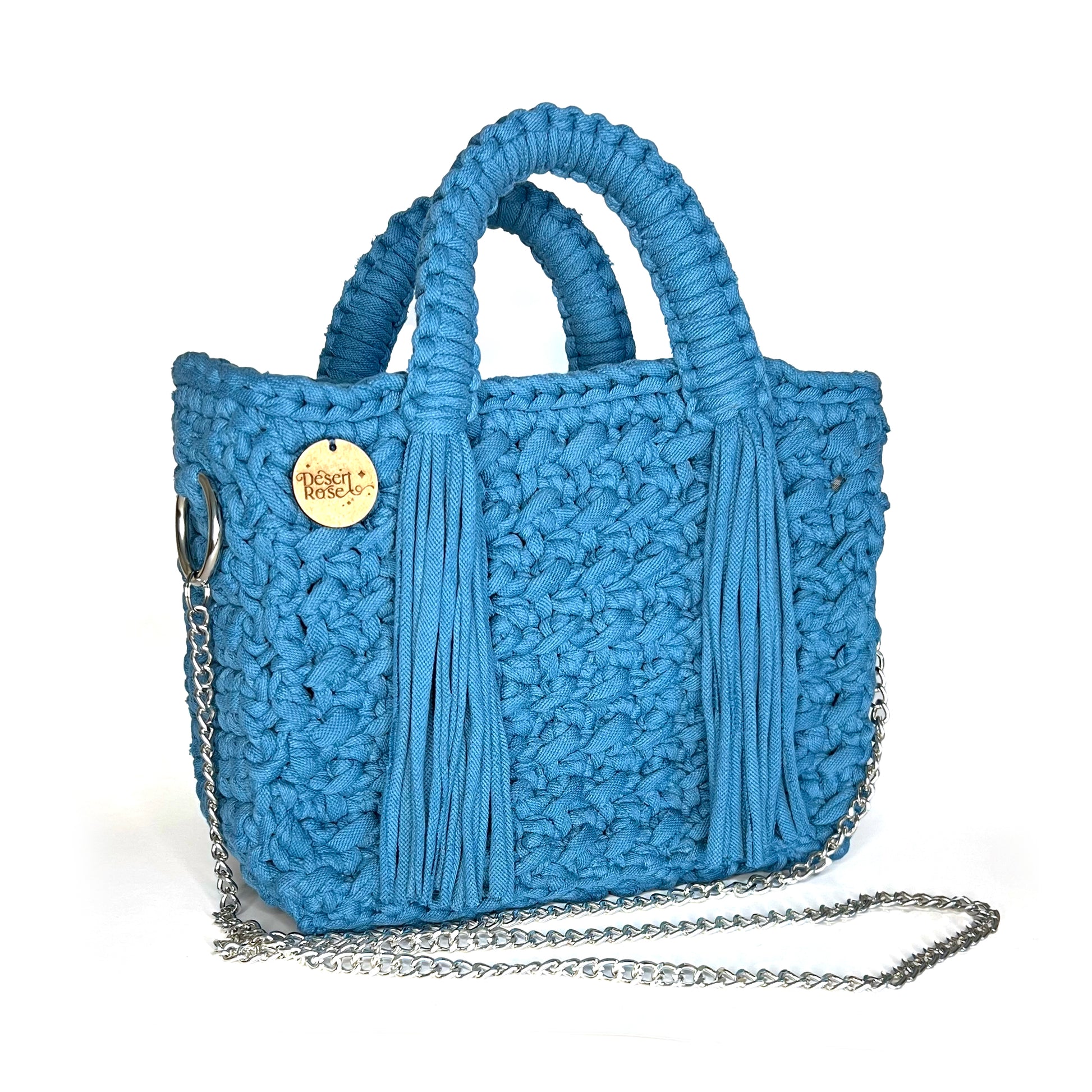 Classic & original crochet blue bag with macrame fringe handles and silver chain. Adorable with your denim jeans.
